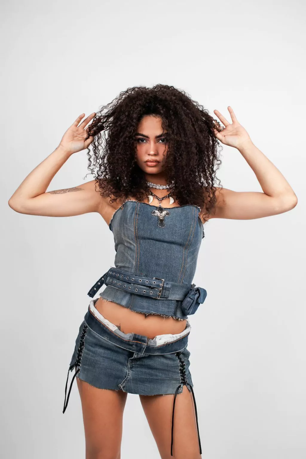 A peça que é puro poder! Corset feito de jeans upcycled, ele vem com um cinto super estiloso e uma bolsa removível. A corrente ajustável na parte de trás do Corset dá aquele brilho único, e o cinto com ilhós e fivelas duplica suas opções de uso. Dá pra usar o conjunto ou cada peça separada, você escolhe!